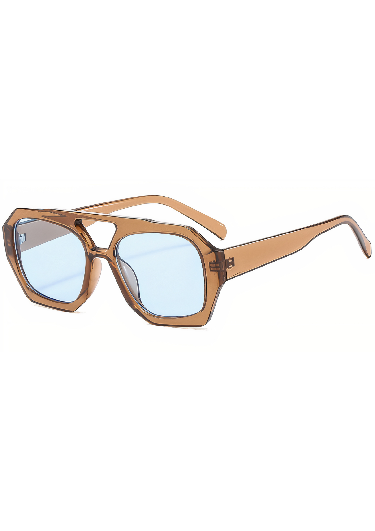 Deze handgemaakte zonnebril uit Italië combineert een warm transparant cognac-montuur met frisse lichtblauwe glazen. De uitgesproken geometrie en uitgesneden neusbrug geven het ontwerp een moderne, architectonische uitstraling — perfect voor de vrouw die zelfvertrouwen en verfijning wil uitstralen. Of je nu flaneert door de straten van Firenze of op een terras aan het Comomeer zit, deze bril trekt gegarandeerd bewonderende blikken.