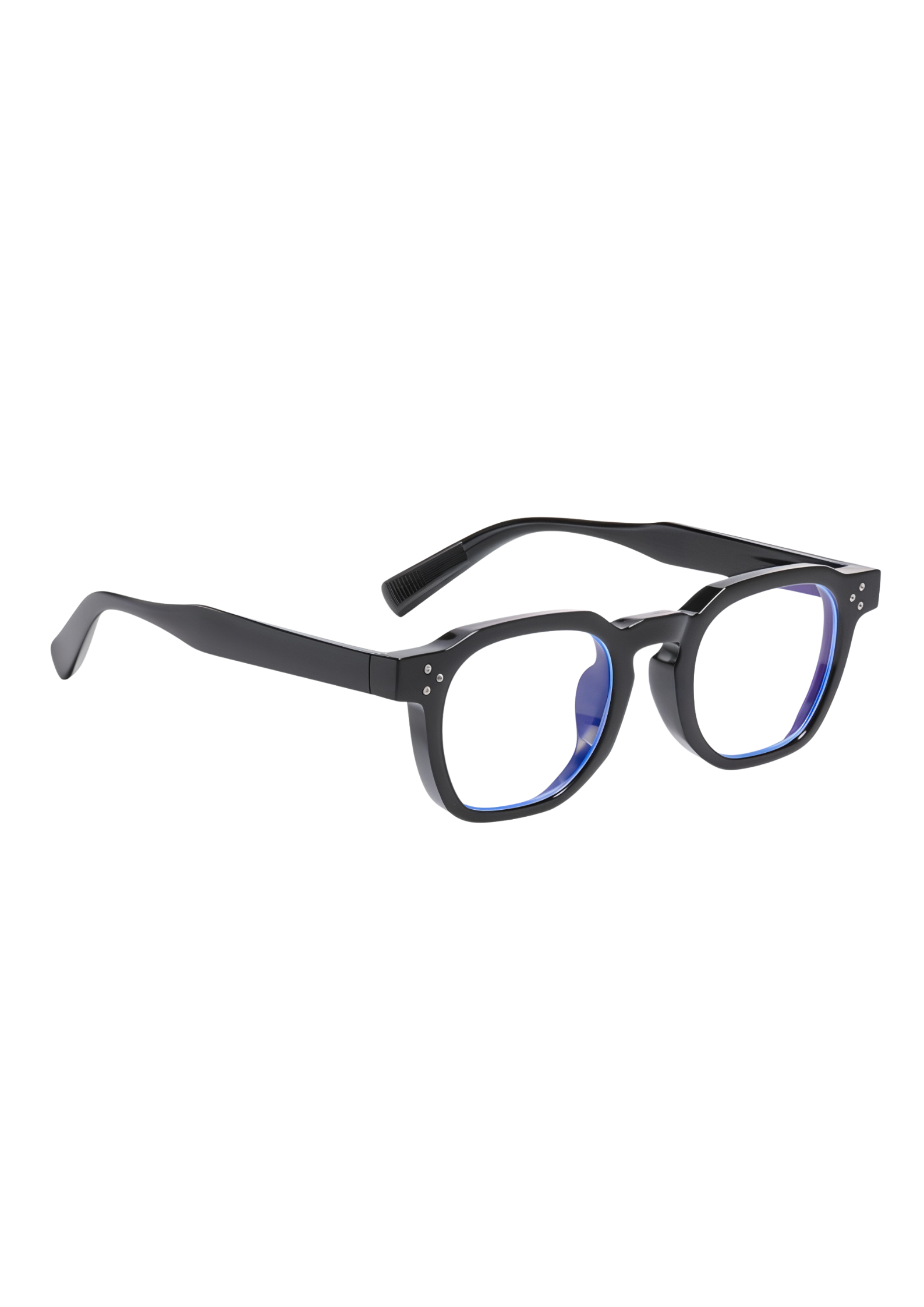 Deze handgemaakte bril uit Italië combineert een matzwart montuur met transparante glazen voorzien van een subtiele blauwe coating. De strakke geometrische lijnen en geraffineerde details zorgen voor een moderne uitstraling die moeiteloos luxe en verfijning ademt.