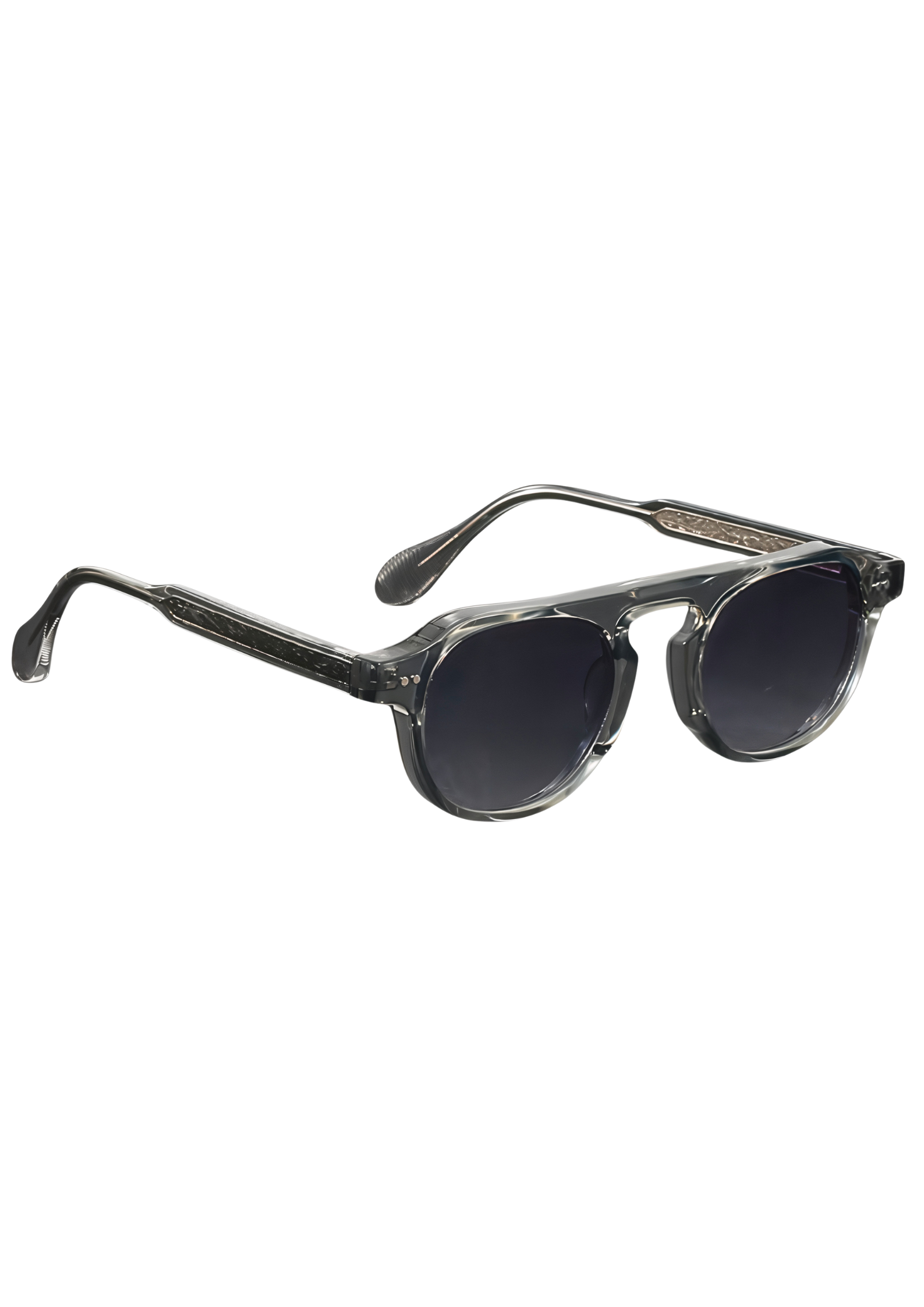 Deze handgemaakte zonnebril uit Italië combineert een helder transparant grijs montuur met elegante diepgrijze gradient glazen. De stoere maar verfijnde constructie straalt een klassieke kracht uit, met moderne lijnen die subtiel verwijzen naar de old money esthetiek.