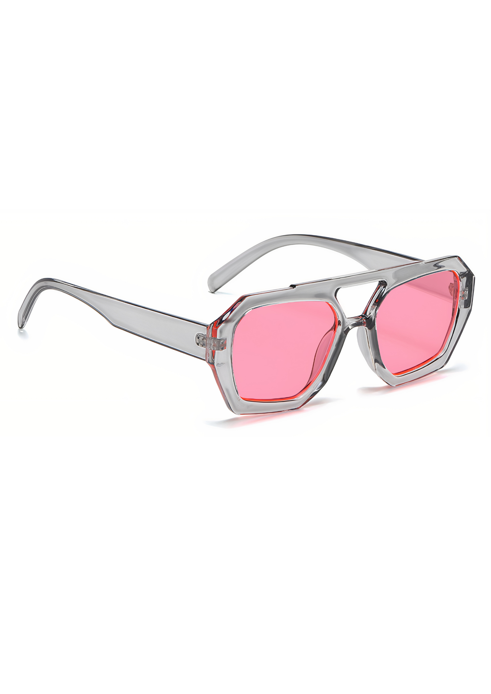 Deze handgemaakte zonnebril uit Italië is een echte eyecatcher. Het geometrische montuur in kristalhelder grijs vormt een verrassend contrast met de levendige roze glazen. De uitgesneden neusbrug en strakke lijnen zorgen voor een modieuze en edgy look — perfect voor wie lef combineert met elegantie. Ideaal voor een zomerse citytrip, een aperitivo aan zee of gewoon om de wereld door een roze bril te bekijken.