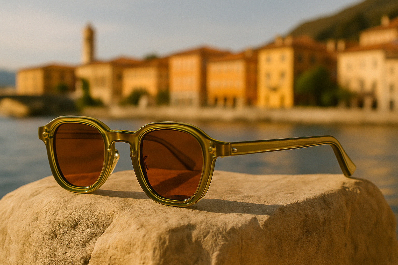 Deze zonnebril is handgemaakt in Italië en combineert een zacht olijfgroen transparant montuur met warm getinte donkeroranje glazen. De verfijnde, licht afgeronde vorm straalt rust en klasse uit. Of je nu flaneert door een Toscaans dorpje of relaxt op een zonnig terras, deze bril is een subtiele eyecatcher met een elegante flair.